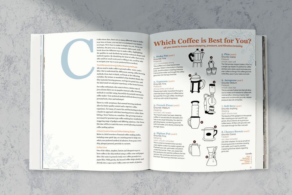 Coffee Decoded was created for the Society of Publication (SPD) design competition. All the illustrations, photography, and hand lettering were created from scratch for this project. This multi-spread design describes how to brew the best cup of coffee. The feeling and aesthetic of the layout are meant to be an easy read that is both fun and sophisticated. Infographics and keys are given to the reader to provide them all about their preferred method of brewing.